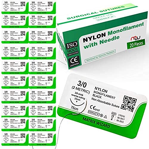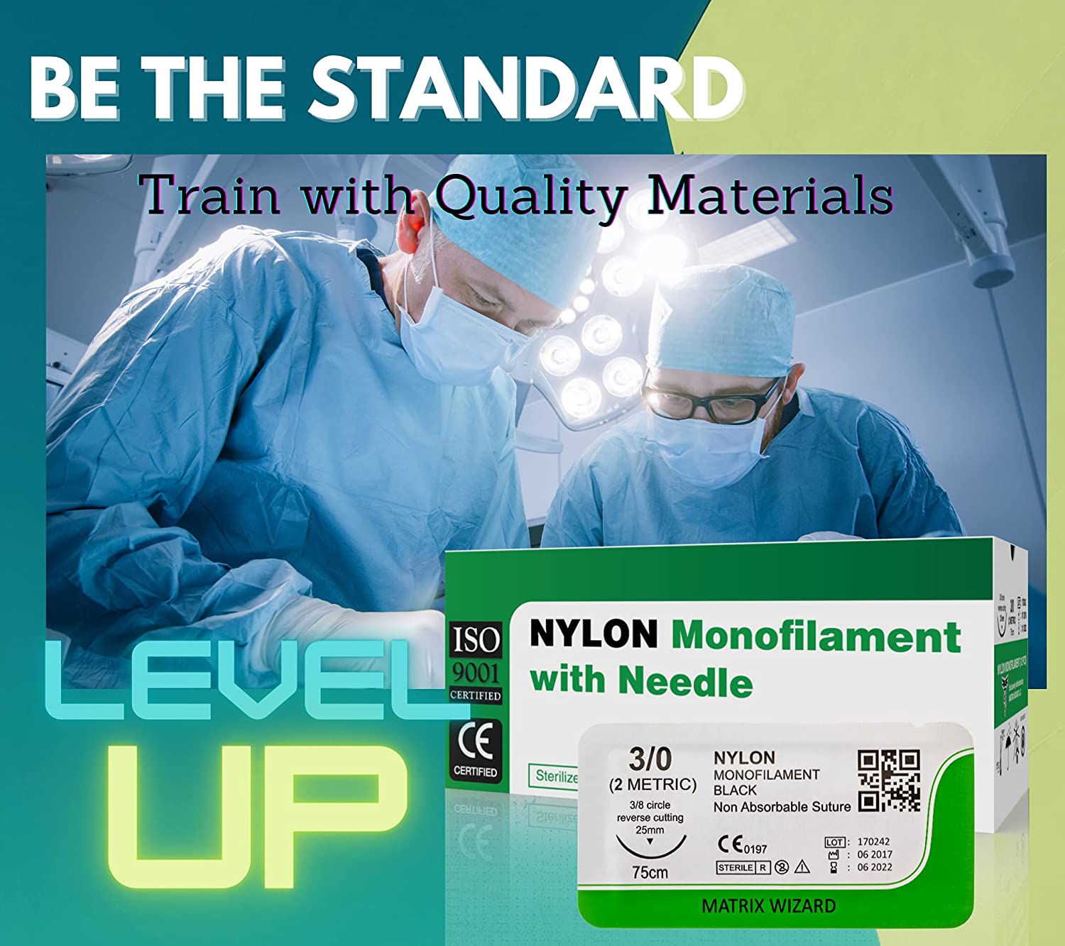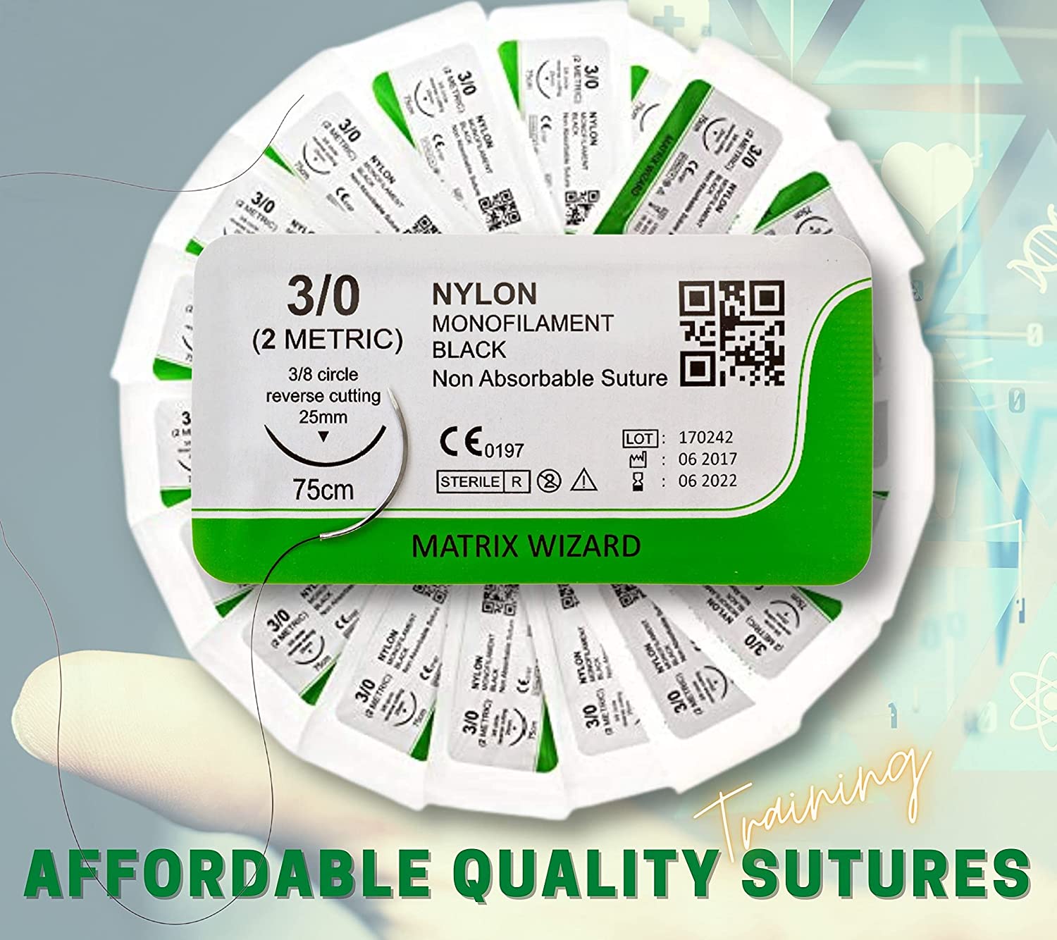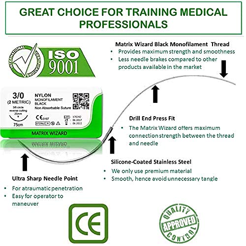 - QUALITY PRODUCT: The 24 Suture TRAINING pack 3-0 black monofilament thread (75cm) is made from quality material that resists repeated bending and optimizes knot integrity. The surgical stainless-steel needle (3/8 Reverse Cutting 25 mm) is silicone-coated, which provides maximum strength and efficiency. We are devoted to providing all learners in the medical field the right tools and supplies to train for suturing realistically. NOT FOR CLINICAL USE.