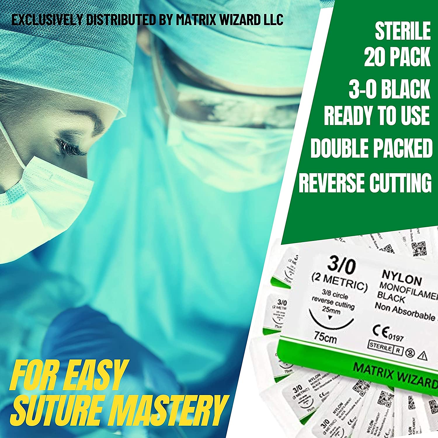 3-0 Sterile Sutures Thread with Needle (24 PK Black Monofilament) - Medical and Nursing Student's Surgical Practice Suture Kit, Training with Stitching Pad, Taxidermy, Vet Use